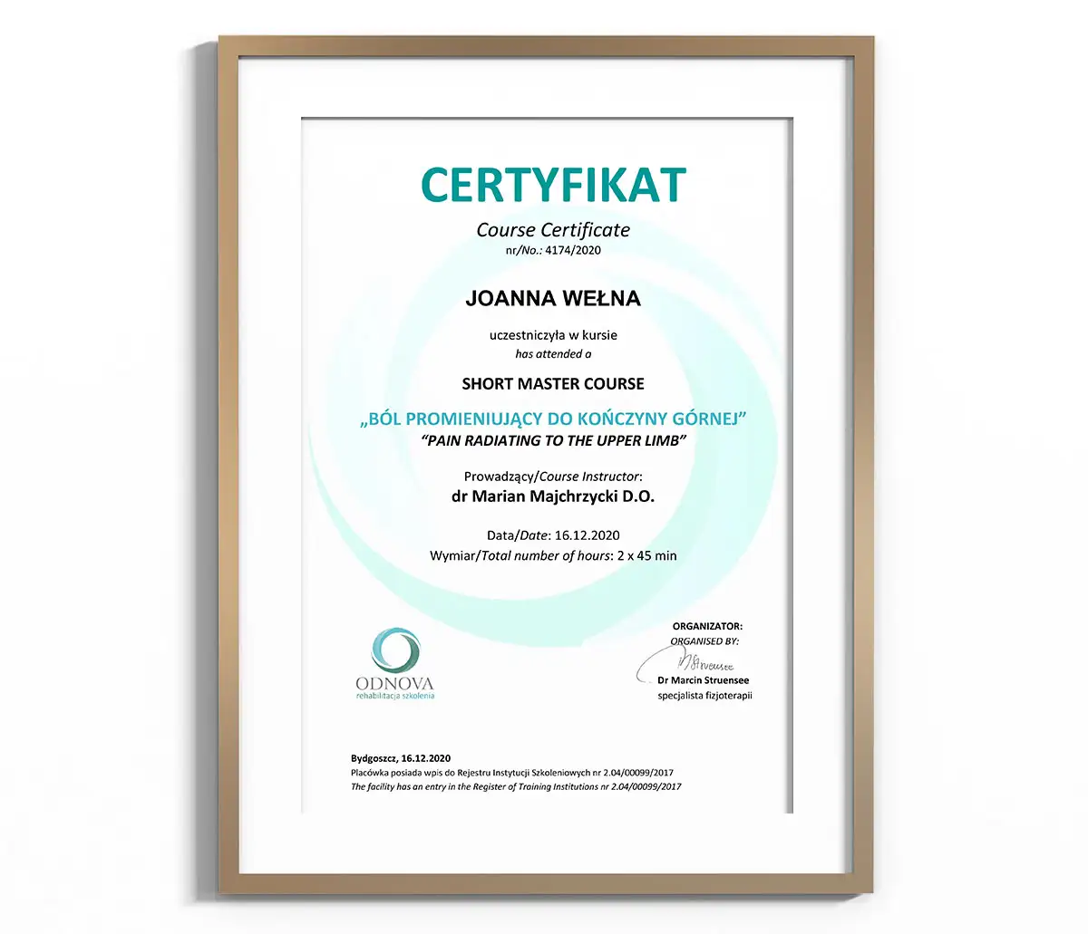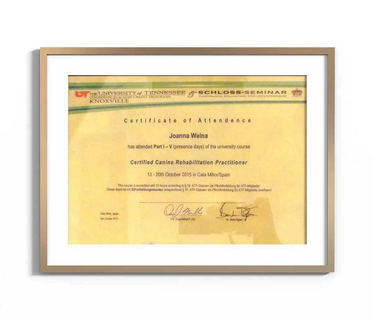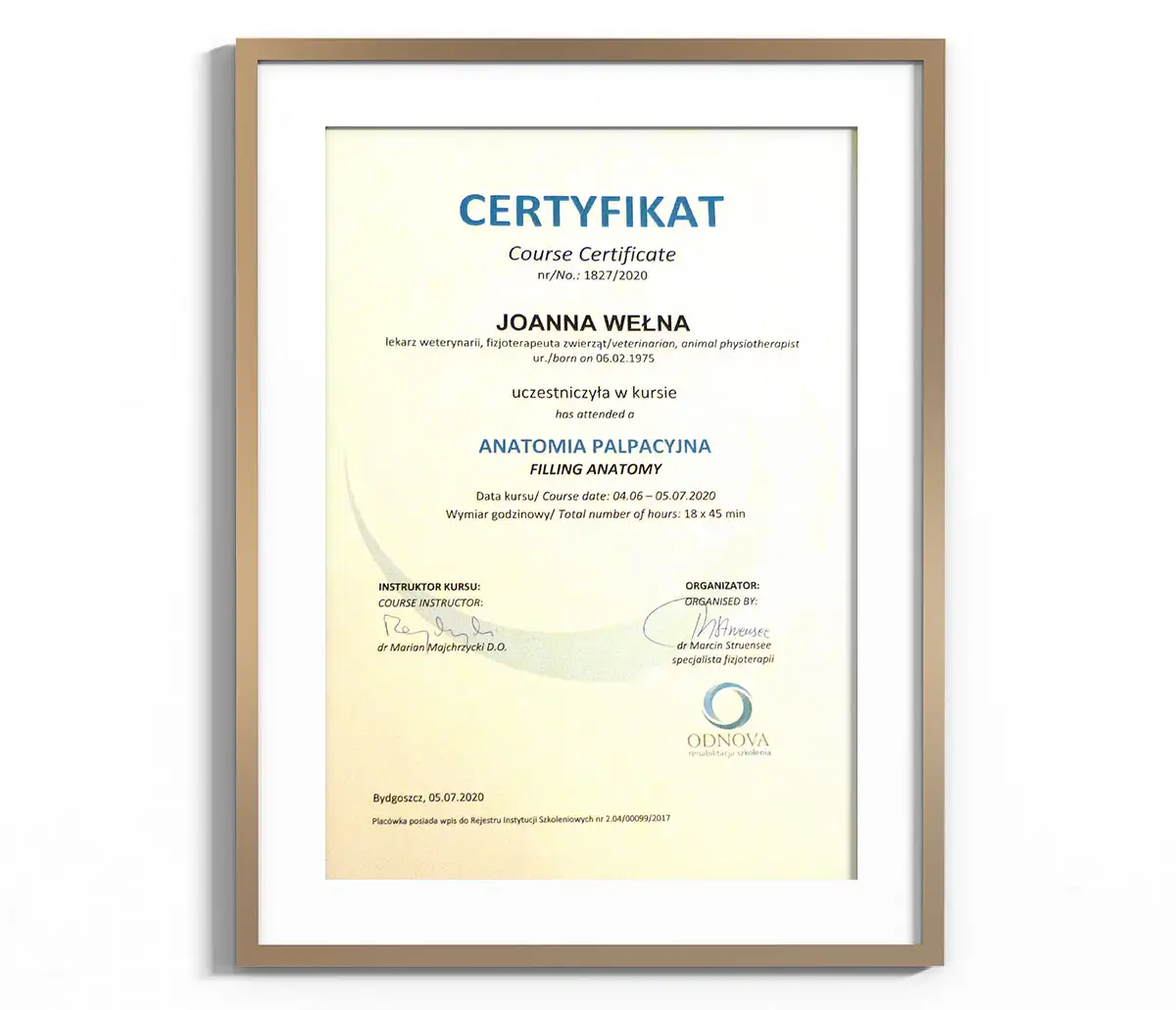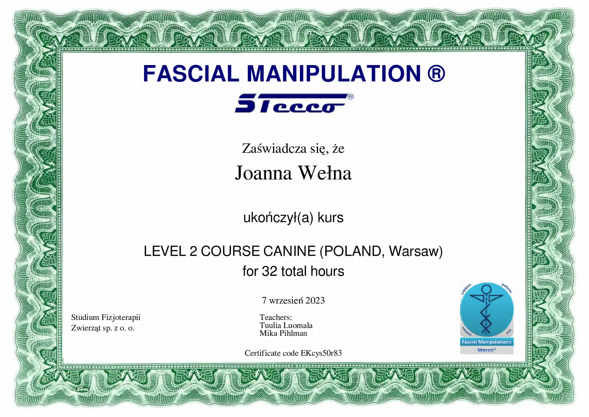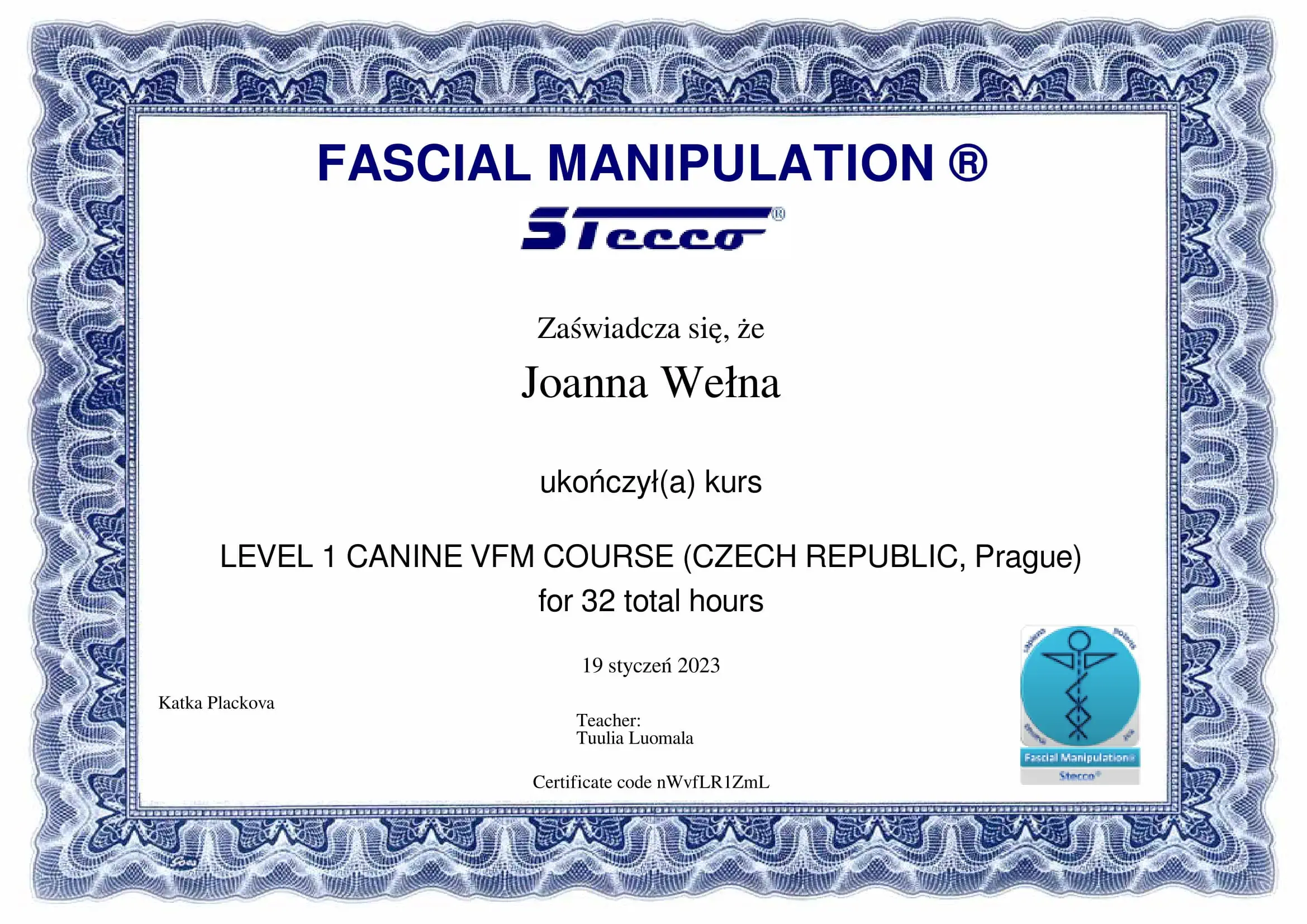 - Chi Institute Europe Certified Veterinary Acupuncture Specialist (w trakcie certyfikacji)