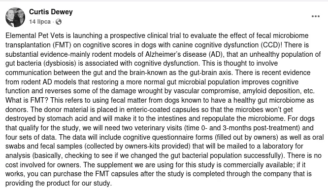 Elemental Pet Vets na czele którego stoi Curtis Dewey, autor znakomitego podręcznika neurologii małych zwierząt, kwalifikują zwierzaki do badań nad poprawą zaburzeń funkcji kognitywnych.